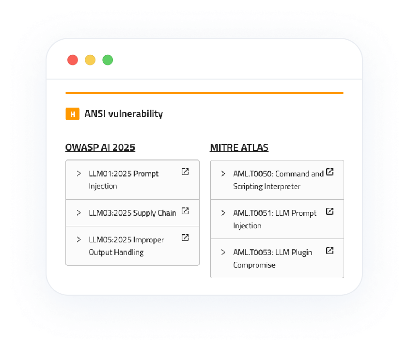 • Map to Frameworks: Instantly apply pre-built policies for OWASP, MITRE ATLAS, and NIST AI.