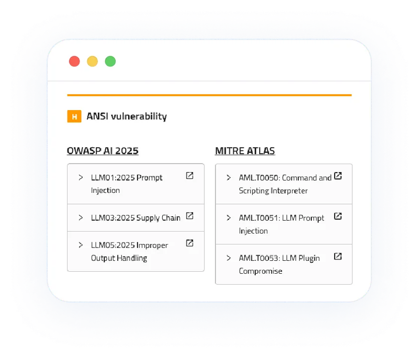 Gain a real-time, comprehensive view of your entire AI attack surface. We correlate deep AI discovery with continuous testing and threat detection, allowing you to instantly identify vulnerabilities and prioritize what matters most.
