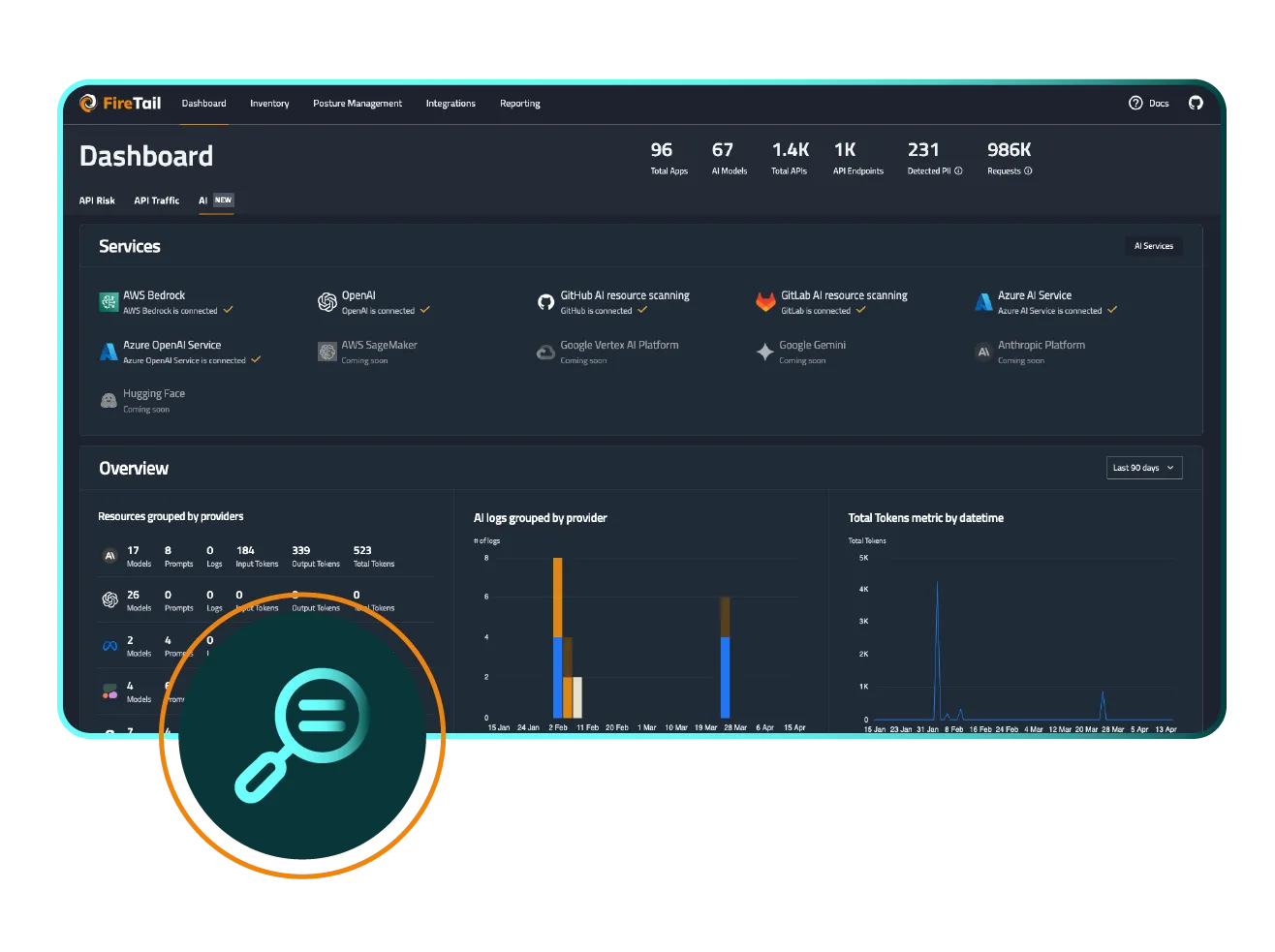 FireTail automatically scans code repositories, cloud environments (such as AWS, Azure, and GCP), and AI service providers (including OpenAI, Anthropic, and Hugging Face) to detect both authorized and unauthorized AI integrations. This process helps identify "shadow AI" and ensures full visibility into your AI ecosystem.